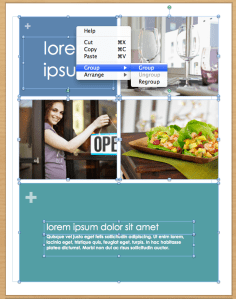 Adjusting the individual elements on each page can be tricky, so I recommend selecting one item on the page, using “ctrl + A”(PC) or “cmnd + A” (Mac) to select all, then right-clicking (or in some cases ctrl+click) on the mouse and selecting the option “Grouping>Group” to group the objects together. This allows you to move all of the page’s contents at once, so you don’t lose the integrity of your design. Be sure to reverse the process by right-clicking after the move and select “Grouping>Ungroup”, so you can once again modify the elements individually.
