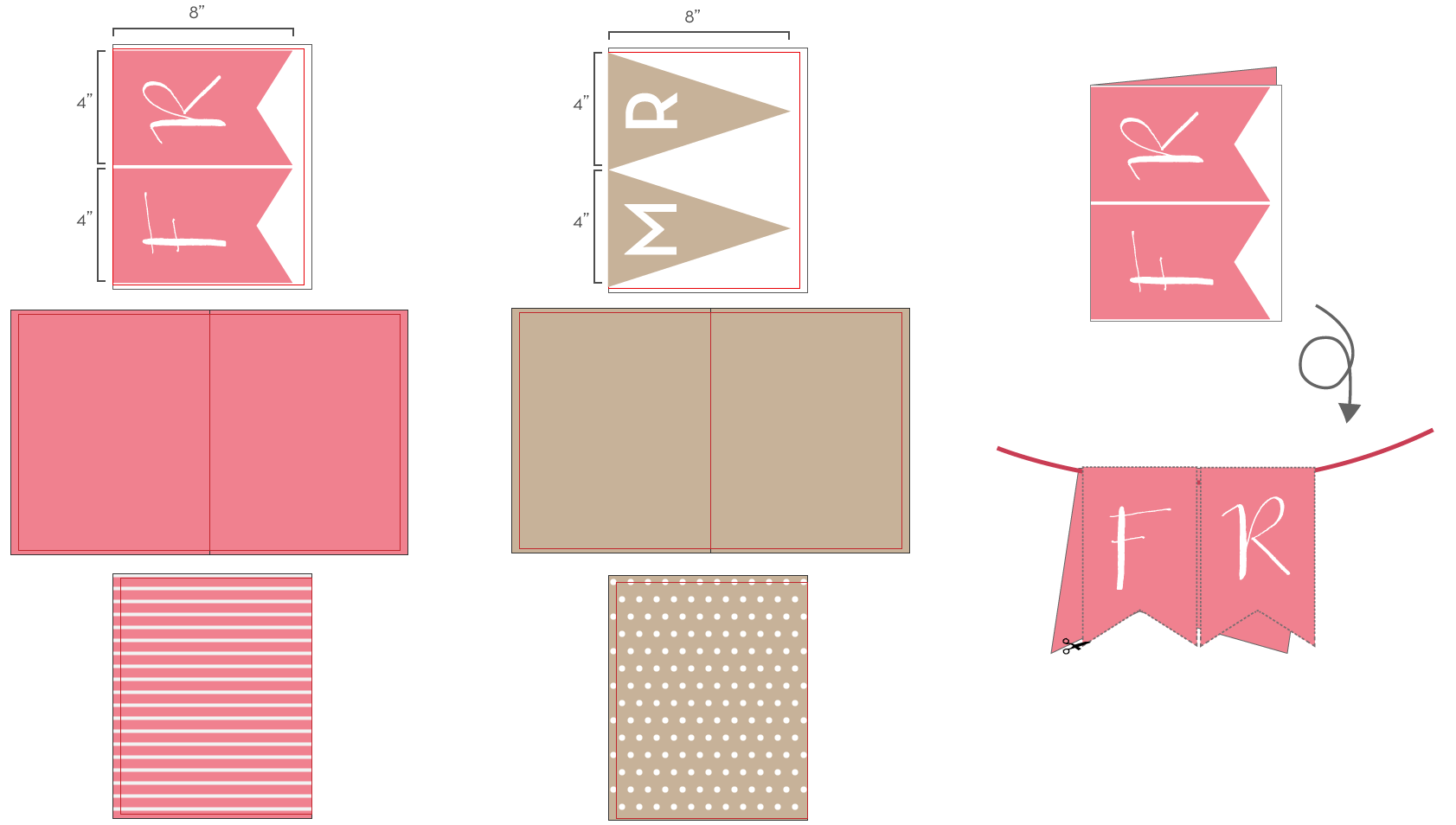 To create your own banner, each pair of letters will need to be designed as it’s own 4-page pamphlet. We used the standard size, 8.25 x 10.75 publication so that we could get 4″ x 8″ pennants. In order to be sure the pennants look great from all sides, we set the full inside “spread” of the document to be a matching color to the outsides (this hides trimming/gluing errors) and to add a little bit of fun, we added a pattern, like stripes or polka dots, to the back sides for when the banner is blowing in a breeze. For the space between words, we used a heart symbol, so the banner would read “FROM❤MS.❤TO❤MRS.” or “SHE♥SAID♥YES.”